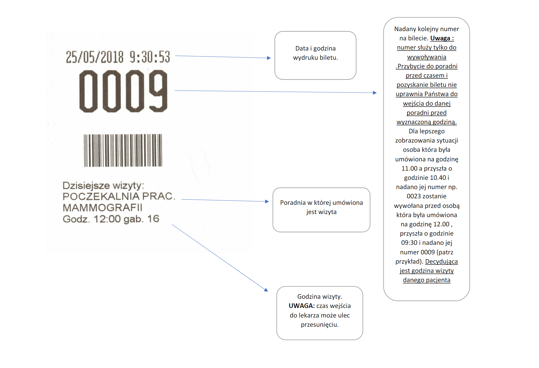 Osoby zarejestrowane w danym dniu na wizytę w momencie przybycia do przychodni otrzymują w rejestracji bilet z przypisanym numerem. Numer ten wyłącznie celom wywoławczym, prosimy o zwrócenie uwagi na godzinę wizyty.